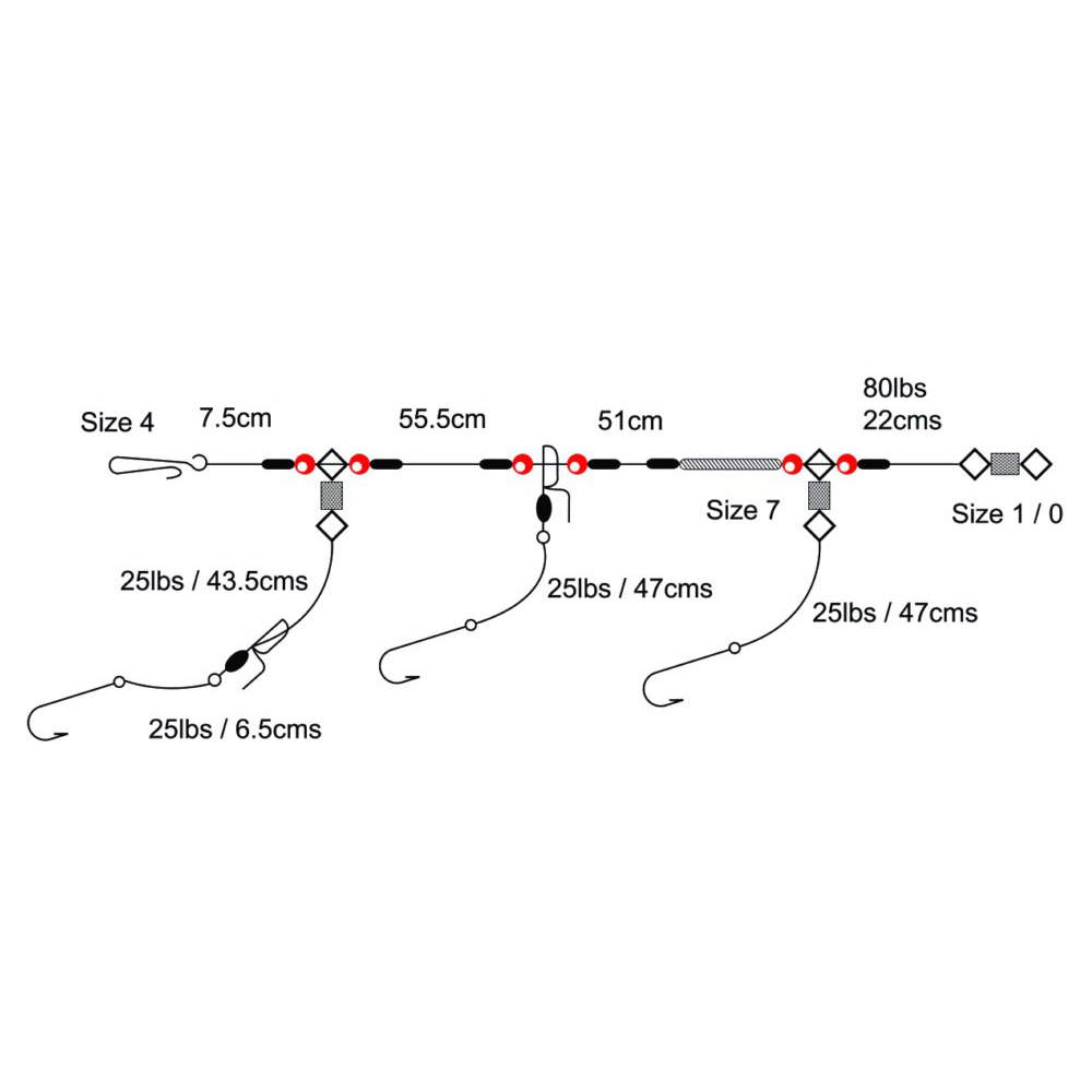 Conçu comme un montage de pêche à distance, le design boucle permet aux hameçons d’être placés derrière le plomb pour un affinage maximum, il permet aussi de pêcher avec un snood inférieur beaucoup plus long, ce qui est idéal lors de la pêche pour les raies et les poissons plats. L’utilisation d’un émerillon roulant avec un clip d’hameçon à mi-chemin sur le snood inférieur permet à ce snood inférieur d’être taillé et affiné. Le snood d’hameçon supérieur est doté d’un ressort de montage en dessous qui maintient le montage serré et évite tous problèmes avec l’étirement du bas de ligne. Ce montage est disponible en versions à deux ou trois hameçons.