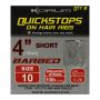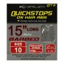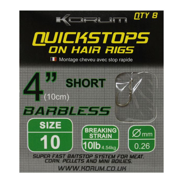 Le montage cheveu de Korum a eu un grand succès depuis sa première sortie et cette dernière addition au catalogue est sûre de continuer à rendre la pêche plus facile. Ces Stops Rapides sur Montages Cheveux sont exactement ce qu’ils disent: le montage cheveu est identique à celui déjà sorti par Korum, cette fois avec un stop rapide fixé sur le bout. Ce système de mise en place d’appât est génial pour les pêcheurs qui ne veulent pas se soucier d’attacher des nœuds délicats qui risquent de se dénouer dans l’eau lorsqu’ils sont mis sous la pression d’un poisson affamé. Le stop rapide est facile à fixer sur une variété de pellets percés, maïs, et appâts viandes; il suffit de pousser une aiguille d’amorçage à travers le trou dans le stop rapide, puis enfiler le tout à travers votre appât choisi. Enlevez l’aiguille et votre montage cheveu est complet avec stop rapide empêchant l’appât de tomber du montage. Les montages cheveux sont parmis les techniques de présentation d’appâts les plus populaires, une position qu’ils tiennent depuis le milieu des années 1970 quand ils ont eu leur premier succès. Les montages cheveux permettent à l’appât d’útre présenté à côté de (mais pas sur) l’hameçon. Les stops rapides sont complètement attachés au cheveu, alors vous n’avez jamais à vous inquiéter que votre appât sera lancé de votre montage au milieu du lancer ou dans l’eau. Ces stops rapides sur montages cheveux prêts à l’emploi réduisent largement le temps que vous passez à amorcer, vous permettant de consacrer la majorité de votre temps à faire ce que vous aimez le plus - la pêche ! Cette innovation de Korum est l’outil de praticité parfait pour la pêche moderne et est disponible sur des hameçons avec ou sans ardillon de tailles variées. Ces Montages Cheveux avec Stops Rapides sont aussi l’outil parfait pour les pêcheurs qui débutent dans le sport et ont peut-être pas les connaissances de fabrication de montage des púcheurs vétérans. Ceci est une solution pratique qui permet à tous les púcheurs de se mettre à pêcher rapidement !