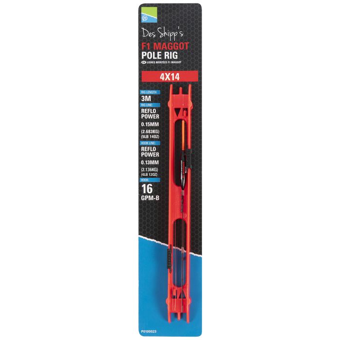 Fabriqués à partir des meilleurs composants et basés sur les montages attachés par nos propres conseillers, les montages de canne flotteur de Des Shipp sont parfaits pour utilisation sur toutes les pêcheries commerciales. Les flotteurs sont maintenant dotés du nouvel œillet latéral Dura qui les rend bien plus puissants que tout autre flotteur avec un œillet latéral standard, sans changer l’équilibre. Reflo Power est utilisé pour toutes les lignes principales et bas de lignes tandis que nos hameçons GPM-B sont l’hameçon polyvalent parfait qui peut être utilisé pour une grande variété d’appâts. Les Stotz sont utilisés sur tous les montages dans un motif de shotting pour convenir au style de pêche envisagé. Le flotteur Asticot F1 a un Brin Creux visible de 1.5mm avec une tige en carbone, cela vous permet de pêcher sur la tombée avec le stotz positionné pour pêcher de manière efficace à travers les derniers 18 pouces d’eau. L’hameçon taille 16 est idéal pour les asticots, casters, vers, et autres petits appâts.