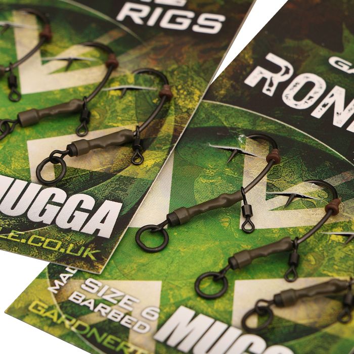 Le paquet de montages Ronnie Rigs Gardner contient trois de ces montages spectaculaires et il y a deux options de tailles différentes disponibles - un hameçon taille six ou taille quatre. Les deux sont fabriqués en utilisant les mêmes composants clés. L’hameçon dans les deux cas est le Covert Dark Mugga Gardner fantastique. Ceci est un hameçon à grand succès et fonctionne incroyablement dans cette mise en place unique. Sur l’œillet du crochet vous trouverez un Émerillon XT Flexi-Ring Kwik Lok. Attachant celui-ci à travers l’œillet déforme la courbure à cause du calibre de fil, ce qui fait une présentation libre et propre.