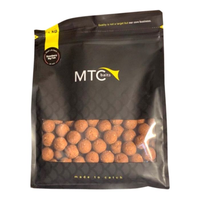 MTC Baits Strawberry Big Fish Shelf Life Boilies, Our most economical fish meal bait but what a winner it is. The Strawberry Big Fish is a classic combination that will keep catching carp time and again. Obviously this is due to the attractive LT Fish Meal which is used in this bait, as well as the first class Sardine Oil. We did not randomly choose a Strawberry Flavour, but were extremely careful. This alcohol-based flavour is the best Strawberry Flavour available and does it really well in fish meal recipes.