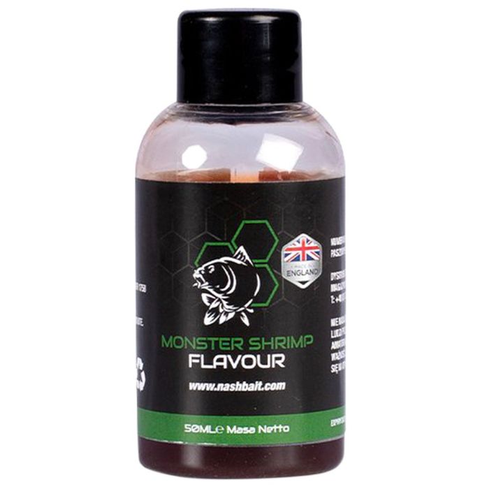 Nash Monster Shrimp Flavour 50ml, The marine trio of Crab, Mature Lobster and Nashbaits deadly Salted Shrimp Paste in a pre-blend at the same levels as the Monster Shrimp boilies. Perfect for custom pop up, hookbait and boilie production. Shake well before use. Supplied in 50ml bottles.
