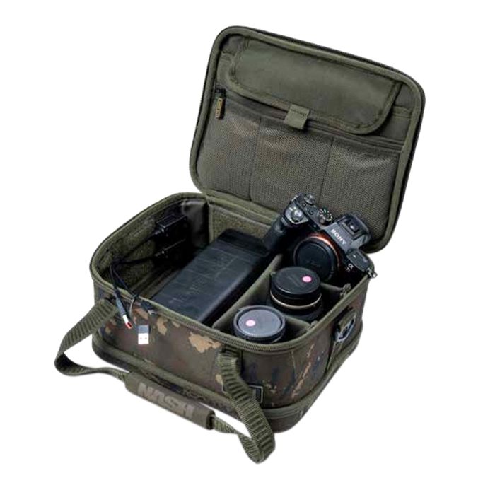 Nash Subterfuge Hi Protect Tech Bag is designed to house everything from tablets up to 25cm to large power packs and camera equipment. With an internal compartment supplied with three adjustable internal dividers to customise as you see fit. A padded under lid pocket designed to take a small tablet plus additional zipped and sub divided under lid mesh pocket for cables and adaptors. With a waterproof wipe clean base and two integral USB-C and USB weatherproof external charging ports.
