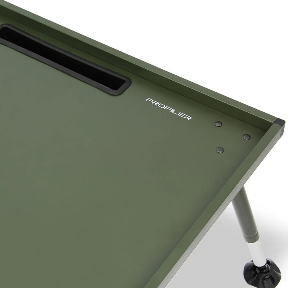 NGT Profiler Bivvy Table, A large heavy duty green table with adjustable twist lock legs. Complete with integrated underside storage bag, slot to hold a phone/tablet (tablet not included) and a soft grommet on the back of the storage bag. Easy to fold flat for storage.
