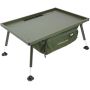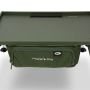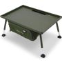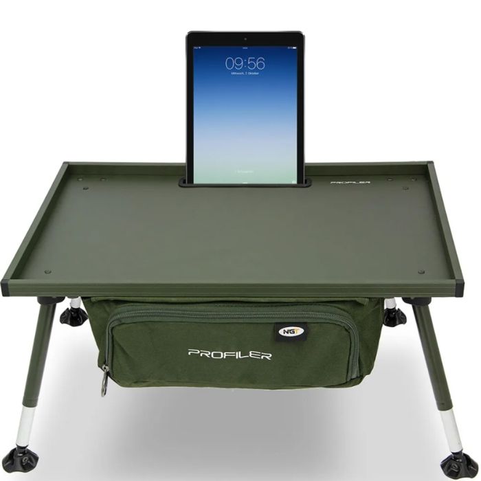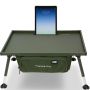 A large heavy duty green table with adjustable twist lock legs. Complete with integrated underside storage bag, slot to hold a phone/tablet (tablet not included) and a soft grommet on the back of the storage bag. Easy to fold flat for storage.