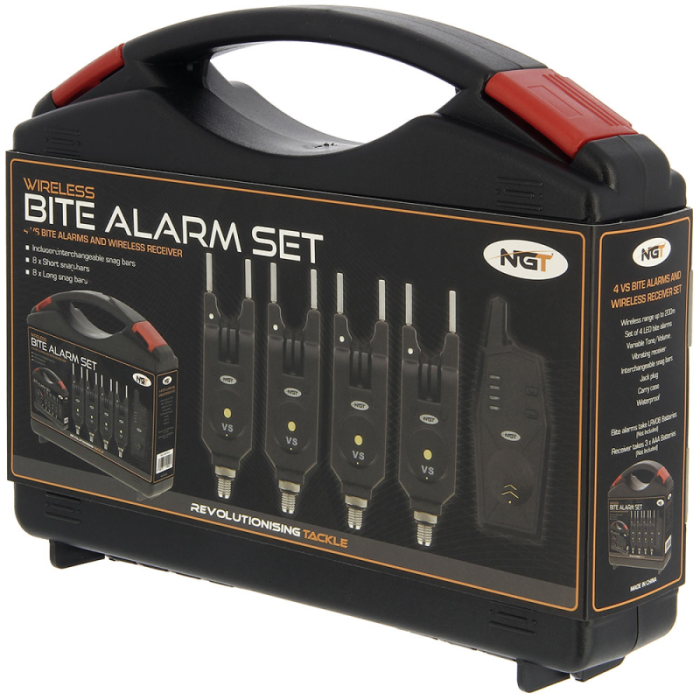 Chaque alarme de morsure est livrée avec deux paires de barres d'accrochage (une paire courte et une paire longue) que vous pouvez visser dans l'alarme de morsure. Les alarmes ont un volume et une hauteur de son réglables et sont imperméables. La portée sans fil peut atteindre 200 mètres et les deux ensembles sont équipés du système de code variable. Ce système pratique permet d'éviter les interférences entre les appareils d'alarme anti-morsure sans fil. L'ensemble avec 3 alarmes de morsure sans fil est livré avec une boîte de rangement pratique.