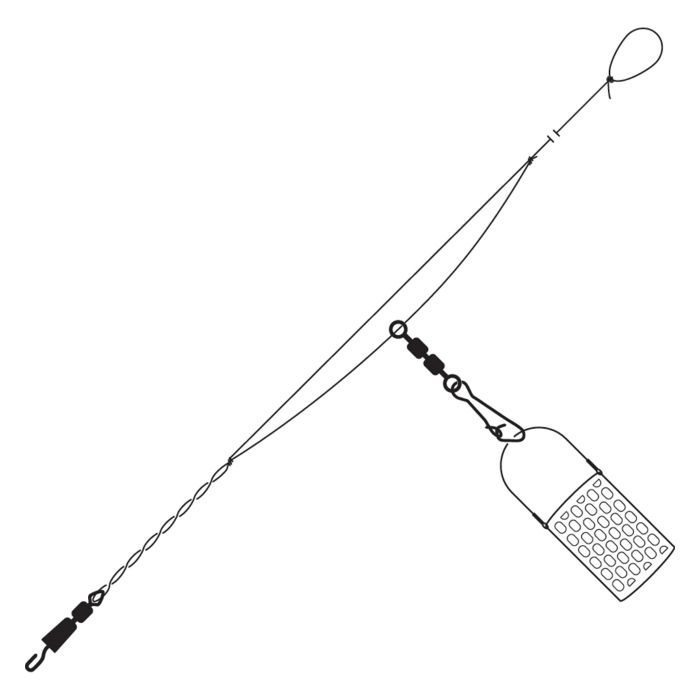 Un montage feeder standard pour les rivières pour de nombreux pêcheurs au feeder car il est simple, super efficace et surtout il ne s'emmêle presque jamais. Le gros avantage est que le poisson ne ressent aucune résistance lorsqu'il engamme l'appât, donc lorsque les conditions sont difficiles et que le poisson est méfiant, c'est le système à utiliser. Il suffit d'attacher votre cage feeder à l'émerillon, votre bas de ligne à l'émerillon rapide et c'est parti !