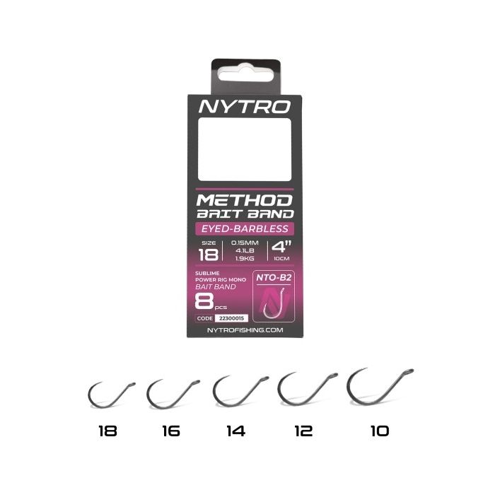 Nytro Nto-B2 Barbless Method Latex Bait Band Ready Tied Rigs, NTO-B2 Barbless Method 4 Inch / 10cm Latex Bait Band Hooks to Nylon The Nytro Method Latex Bait Band Hooks to Nylon are designed specifically for method feeder fishing, offering the perfect set-up when targeting F1s, carp or tench. Tied at 10cm and featuring a durable latex bait band, these rigs are ideal for presenting wafters or hard pellets directly on the feeder. Built with Sublime Power Rig Mono and the barbless NTO-B2 strong offset circle-type hook, which includes an upturned eye, these rigs ensure solid hook-ups and consistent performance straight from the pack.