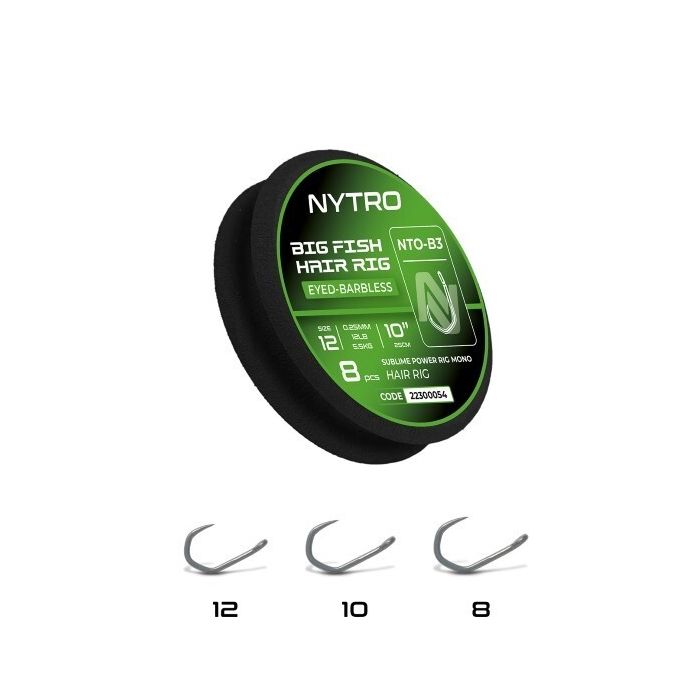 Nytro NTO-B3 Barbless Big Fish Mono Hair Ready Tied Rigs, The Nytro Big Fish Mono Hair Hooks to Nylon are purpose-built for targeting the giants of commercial venues whether it is carp, catfish, or even sturgeon in wild or adventure lakes. Tied at 25cm in length with a robust mono hair, these rigs are ideal for presenting a wide range of baits such as boilies, meat, or even herring sections to tempt the most powerful fish into your swim. Each rig is tied with increased diameters of reliable Sublime Power Rig Mono to match the demands of specimen fishing, and features the barbless NTO-B3 hookultra-strong, heavy gauge, and designed with an in-turned eye for a secure hook hold under extreme pressure.