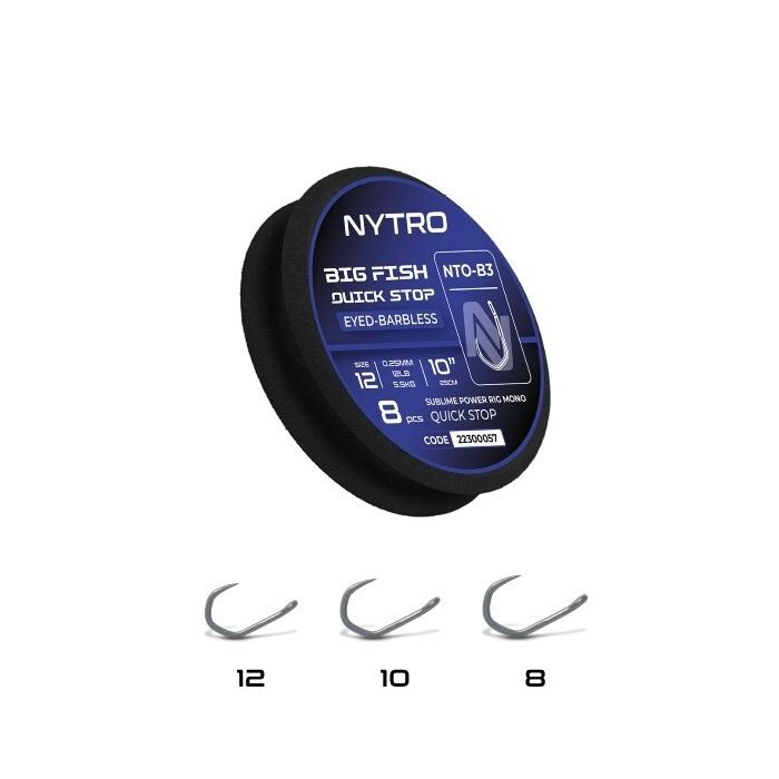 Nytro NTO-B3 Barbless Big Fish Quick-Stop Ready Tied Rigs, The Nytro Big Fish Quick-stop Hooks to Nylon are built for targeting the powerful carp, catfish, and sturgeon found in wild and wdventure lakes. Tied at 25cm in length and fitted with a quick-stop, these rigs enable fast and secure baiting of a wide variety of hook baits including boilies, meat, pre-drilled pellets and corn. Crafted with heavy-duty Sublime Power Rig Mono and equipped with the barbless, heavy-gauge NTO-B3 hook featuring an in-turned eye, these rigs deliver strong, reliable hook holds under demanding conditions.