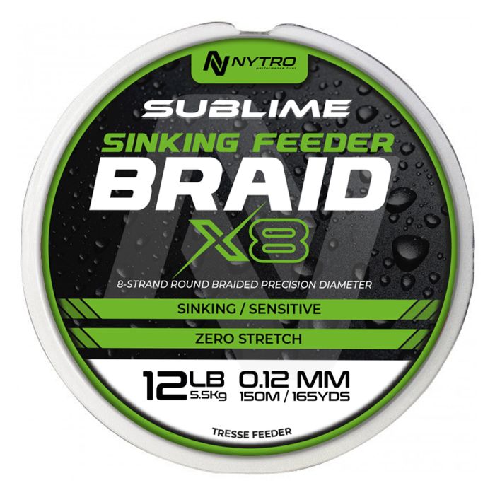 NYTRO SUBLIME X8 SINKING BRAID est une tresse coulante rapide 8 brins de haute qualit, conue spcifiquement pour la pche au feeder, grce a son pouvoir trs coulant, cette tresse 8 brins ronde, rgulire et a la surface lisse est de couleur fonce, elle offre peu d'tirement et une rsistance leve aux nuds, c'est certainement la tresse feeder la plus idale pour les pches longues distances ou alors de prcisions sur les touches compliques. Disponible en trois diamtres (0,08 0,10 et 0,12) pour les situations les plus courantes et sur des bobines de 150 m