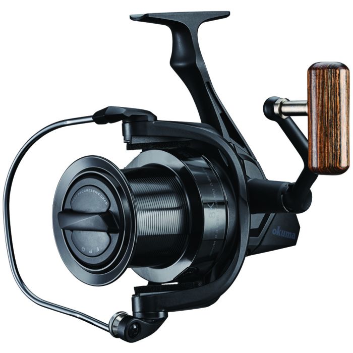 The new standard for big pit carp reels. With its large-diameter spool and the Slow Oscillation System, Okuma’s ultra-durable 8K spinning reel delivers incredible casting distance while ensuring a peerlessly smooth operation. Built for bulletproof endurance, the 8K’s large bail arm and spool are both made from solid aluminum. The reel’s fast progressive drag system boasts 18 kg of stopping power, making it the ideal companion for targeting big fish on big waters. For maximum anti-corrosion endurance, the 8K’s Hydro Block technology seals the reel’s drag system in a water-tight enclosure ,while the Cyclonic Flow Rotor Technology ushers all excess moisture out of the reel’s housing with a cyclone-like airflow. The 8K is finished with a tasteful black design and a weighted wooden handle knob that rests in a vertical position – always lining up perfectly.