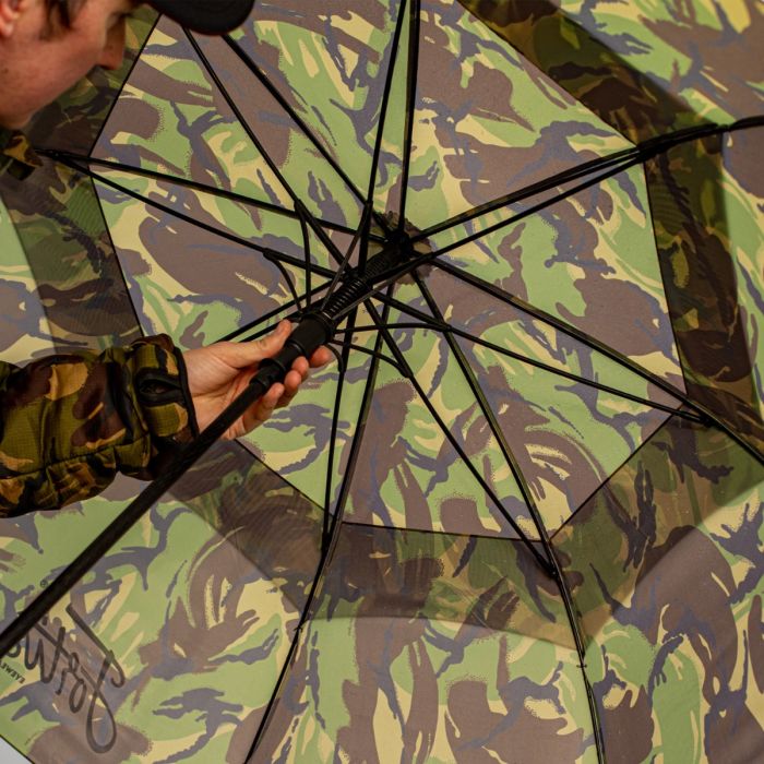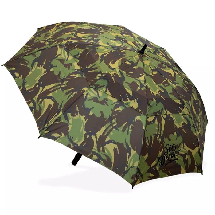Un parapluie qui mesure 60 pouces conçu pour le pêcheur mobile, offrant une protection maximale lors de la première chasse par mauvais temps. Un parapluie DPM à une seule couche avec un toit coupe-vent pour aider à empêcher l'inversion avec un marquage subtil.