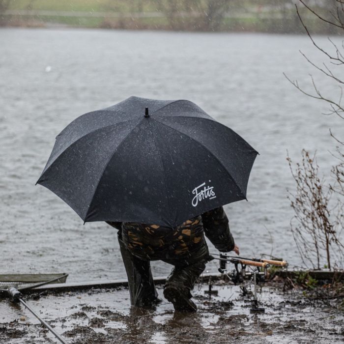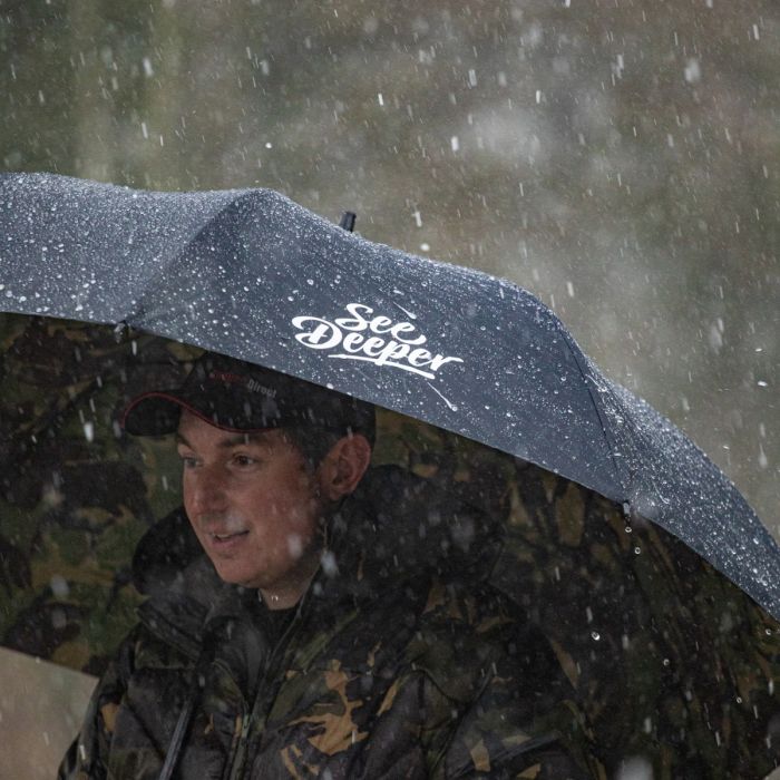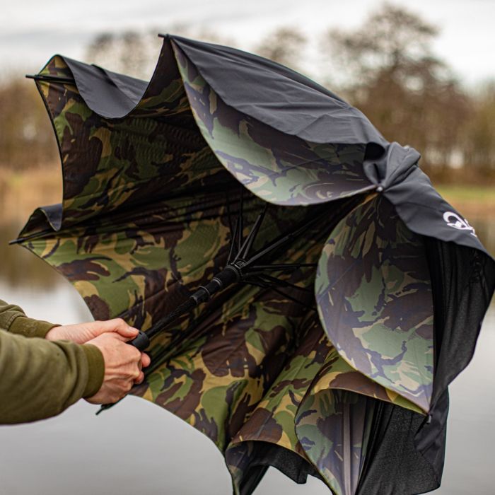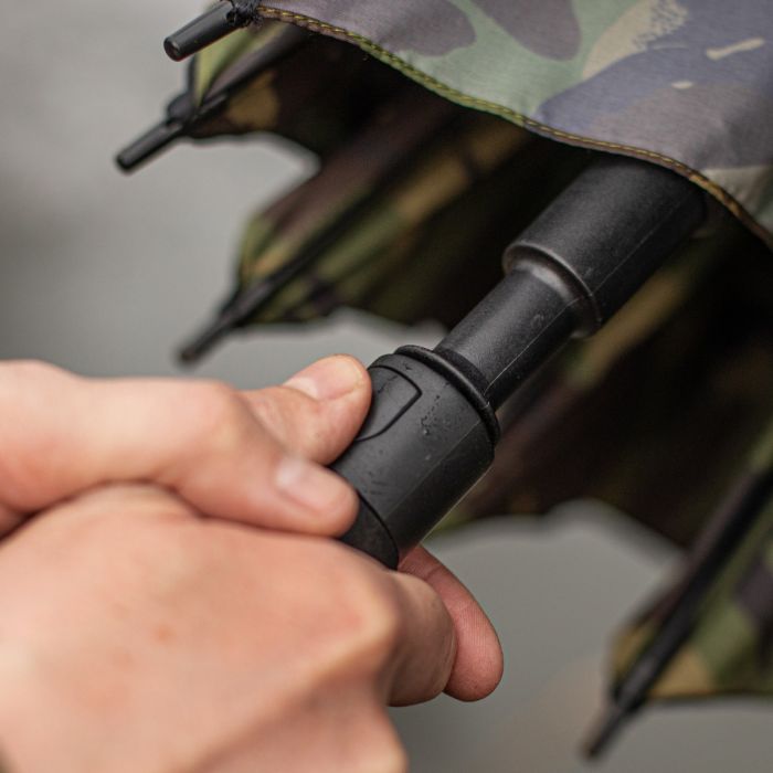 Un parapluie 2 couches, noir à l'extérieur, DPM à l'intérieur. Doté d’une armature robuste pour résister aux conditions climatiques extrêmes. Il dispose d’un axe en fibre de verre avec une poignée ergonomique et antidérapante. Conçu pour le pêcheur mobile, offrant une protection maximale lors de la première chasse par mauvais temps.