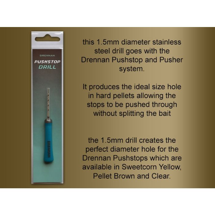 Perceuse d’amorçage en acier inoxydable diamètre 1.5mm conçue pour utilisation avec les systèmes Quickstop/Pusher Drennan. Elle crée le trou idéal dans des pellets durs permettant au montage cheveu et quickstop de passer à travers sans briser l’appât.