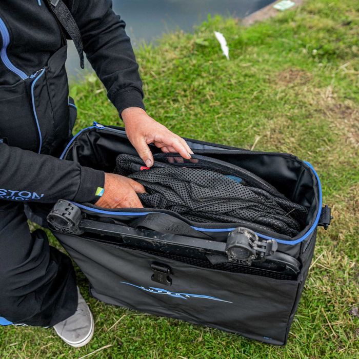 Un sac à bourriches compact qui permet de ranger jusqu'à trois bourriches et une série de têtes d'épuisettes. Fabriqué en matériau robuste 840D et doté d'une doublure interne imperméable facilitant le transport des filets mouillés.