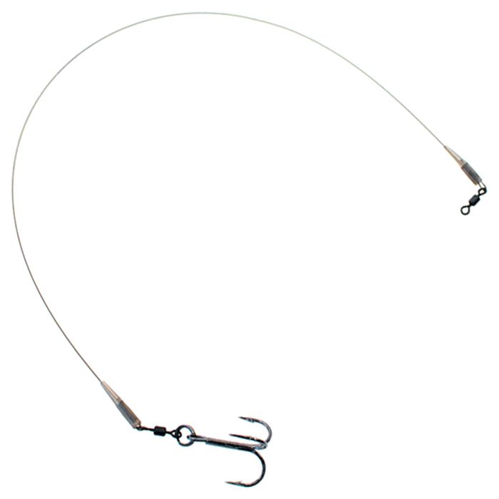 Ces palans sont équipés d'un hameçon triple VMC 9650 de taille 2. Cet hameçon triple est attaché à un anneau fendu, qui est lui-même attaché à un émerillon. Ce presse-étoupe est fixé au fil Ultra Thin Wire. De cette façon, l'hameçon triple tourne à 360 degrés par rapport au fil d'acier. La ligne sera ainsi moins susceptible de se vriller.