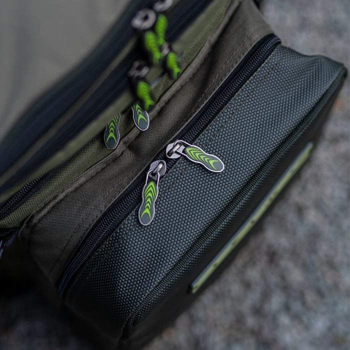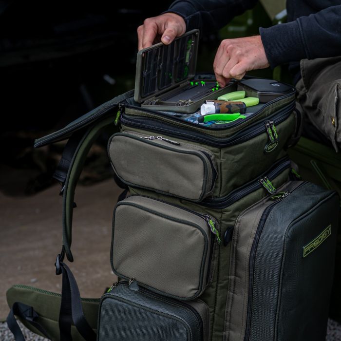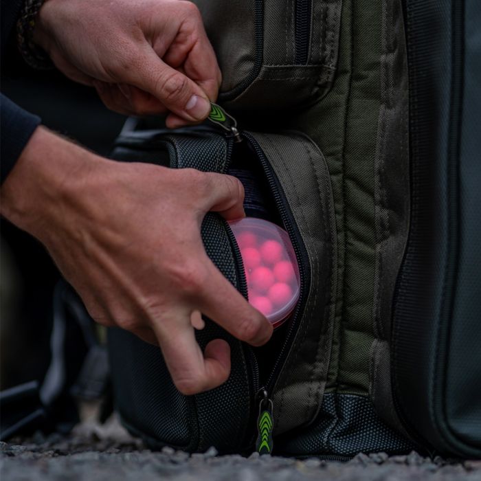 Le grand compartiment principal est idéal pour les vêtements et les ustensiles de cuisine pour préparer une bonne potée - ou même une friture ! - pendant les pauses ou vous assurer rapidement et facilement que vous êtes convenablement équipé en cas de changement de temps, en enfilant vos vêtements imperméables ou changeant ce pull épais pour un t-shirt lâche. Pendant ce temps, la poche avant jumbo est conçue pour s'adapter parfaitement à la boîte à outils Prodigy Klip-Lok, mais peut également accueillir d'autres contenants de style similaire ; un compartiment à appâts isolé assure que tous les ingrédients de votre régime d'appâts restent frais et en excellent état, prêts à attirer instantanément la carpe cachée une fois que vous les mettez à l'eau.