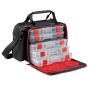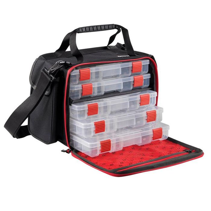 Le sac à leurre Medium est un sac à leurre de taille moyenne qui contient 5 boîtes à leurre vides (moyennes). Il possède une bandoulière réglable et 2 sangles de transport. Le sac a 2 poches latérales pour les pinces/accessoires et une grande poche principale pour les boîtes de rangement. Le compartiment principal est équipé d'un dispositif permettant de laisser 2 (ou 3) boîtes hors du sac et de les remplacer par un appareil photo, de la nourriture ou d'autres objets. Toutes les fermetures éclair sont de bonne qualité et le fond est très solide et imperméable. Sac idéal pour la pêche au leurre.