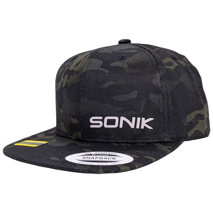 Stylish MultiCam® snap back pattern with six panel construction giving this cap plenty of rigidity. Hard buckram structured flat visor. Featuring a snap-tab size adjuster at the rear and Sonik S logo 3D embroidered.