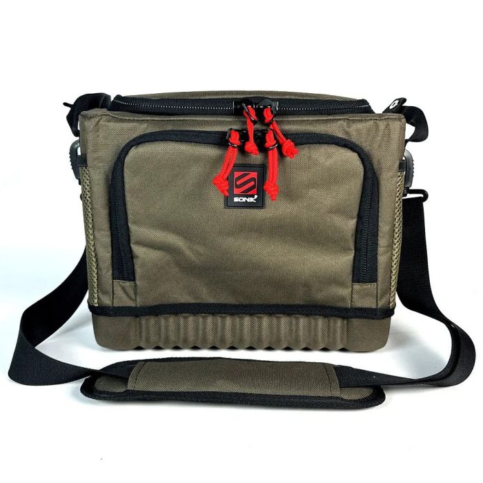 The SONIK STORZ™ luggage brings a new concept to modular fishing kit storage. All of the STORZ™ range are designed to be modular and stackable but also rugged and built to last. They feature our new RIGIDZ™ internal steel frame that provides support so that these bags can stack on top of each other to create many different storage layout options. The range is split into two height and three length options. All STORZ™ LOW products have a height of 22cm which is perfect for under bedchair storage. Heavy duty waterproof EVA bases and side grab handles make these bags ideal for sliding underneath your bedchair. It also makes them perfect for middle or top tier options when you want to stack your STORZ™ system. The other STORZ™ models all have a height of 32cm; these are great for general all-round storage options and as base units for when you want a stacked storage unit. Lengths are split into three options of 20, 40 and 60cm which allow you to create all sorts of modular layout options. To complete the range are two tabletop products which are compatible with the 40 and 60cm sizes respectively. These are great for turning your STORZ™ system into a full bivvy table unit when required.
