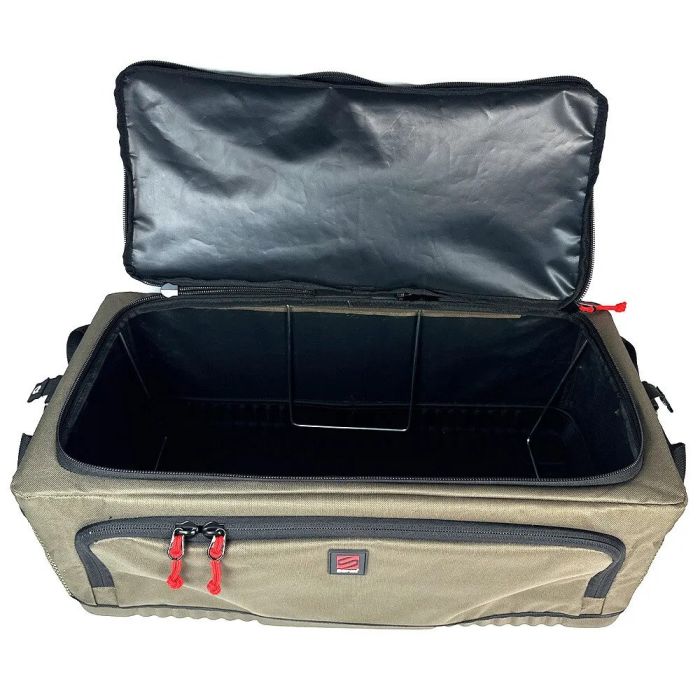 The SONIK STORZ™ luggage brings a new concept to modular fishing kit storage. All of the STORZ™ range are designed to be modular and stackable but also rugged and built to last. They feature our new RIGIDZ™ internal steel frame that provides support so that these bags can stack on top of each other to create many different storage layout options. The range is split into two height and three length options. All STORZ™ LOW products have a height of 22cm which is perfect for under bedchair storage. Heavy duty waterproof EVA bases and side grab handles make these bags ideal for sliding underneath your bedchair. It also makes them perfect for middle or top tier options when you want to stack your STORZ™ system. The other STORZ™ models all have a height of 32cm; these are great for general all-round storage options and as base units for when you want a stacked storage unit. Lengths are split into three options of 20, 40 and 60cm which allow you to create all sorts of modular layout options. To complete the range are two tabletop products which are compatible with the 40 and 60cm sizes respectively. These are great for turning your STORZ™ system into a full bivvy table unit when required.