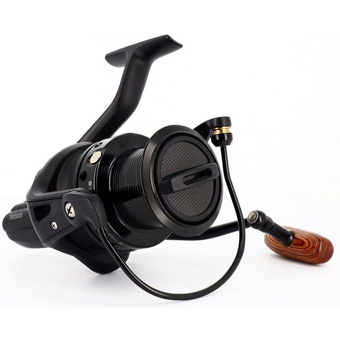 Moulinet de grande capacité avec frein avant conçu pour la pêche à la carpe. Il est fiable et durable, peut gérer toutes les conditions. Corps étanche et léger en composite graphite noir au design épuré et mat. Moulinet en aluminium haut de gamme au design long cast, rotor équilibré par ordinateur, grand spinner anti-retour, frein micrométrique lisse de précision, enroulement croisé en S, système de double oscillation lente, manivelle solide et durable avec embout en bois, bascule renforcée, roulements en acier inoxydable.