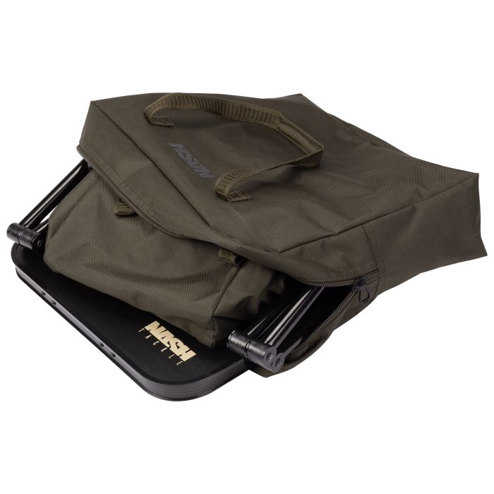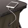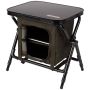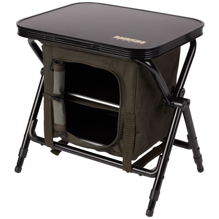 La petite station avec une double étagère et une table se replie facilement. Avec le plateau spécial, vous avez la surface de travail idéale pour manger, construire et attacher ou pour stocker à l'intérieur des récepteurs, des powerpacks et des téléphones portables. Le piètement réglable et pivotant assure un soutien stable à la table ainsi que l'équilibre sur les terrains accidentés. Le compartiment intérieur permet d'accéder au contenu sur trois côtés avec des fermetures à glissière et est fixé par des fermetures velcro et des fermetures à garrot élastiques.