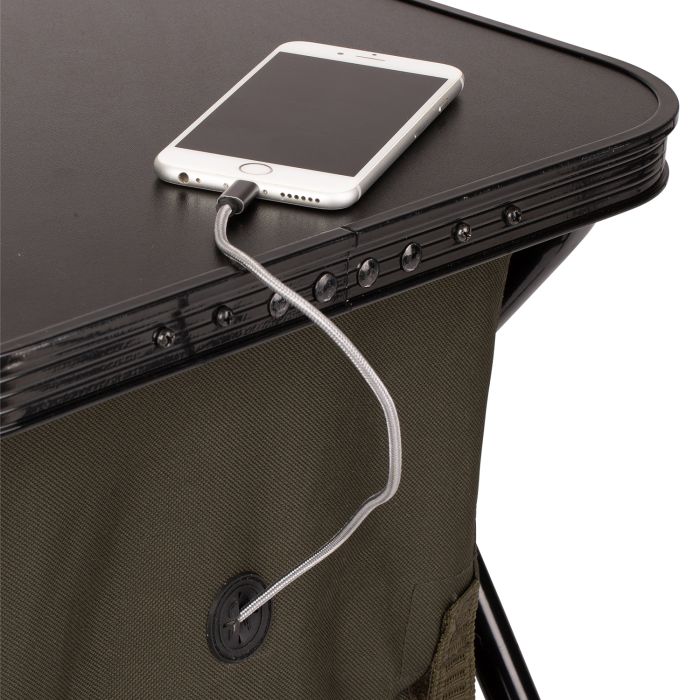 Organisation compacte avec une surface de travail pratique pour les fans des petits abris. Utilisant le design de cadre qui se plie à plat X Frame éprouvé pour puissance mais rangement plat, le modèle Compact a l’addition d’un trou de sorti de câble caoutchouté à l’arrière pour permettre aux Power Packs d’être connectés aux téléphones sur la surface de travail ou dans des poches de système de sommeil.