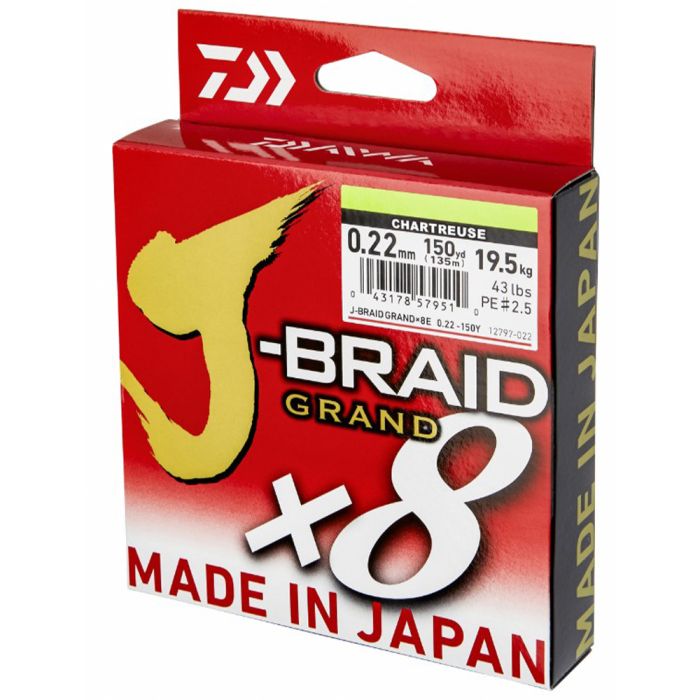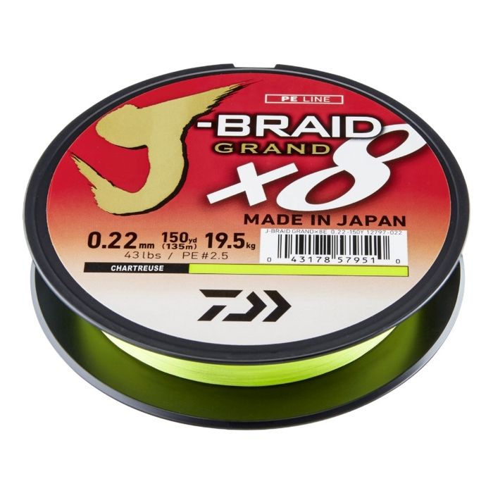 La tresse J-Braid Grand X8 est la version perfectionnée de la fameuse J-Braid X8. Afin d'offrir encore plus de sécurité en pêche et durant le combat, la Grand X8 a été optimisée. La tresse J-Braid Grand X8 est parfaite en mer pour la pêche des cabillauds, flétans & co, comme en eau douce pour les perches, sandres et brochets. En comparaison avec la J-Braid X8, la Grand X8 est plus serrée ce qui procure une meilleure résistance à l'abrasion et aux nœuds. Grâce à un procès de fabrication spécial où elle est étirée, la résistance à l'abrasion et la résistance linéaire de la J-Braid Grand X8 sont décuplées. Elle est un peu plus raide que la J-Braid X8 ce qui est très appréciable quand il y a du vent et que les conditions sont difficiles, mais la J-Braid Grand X8 reste tout de même souple et très silencieuse.