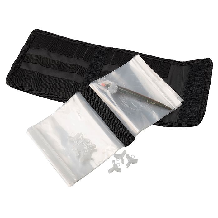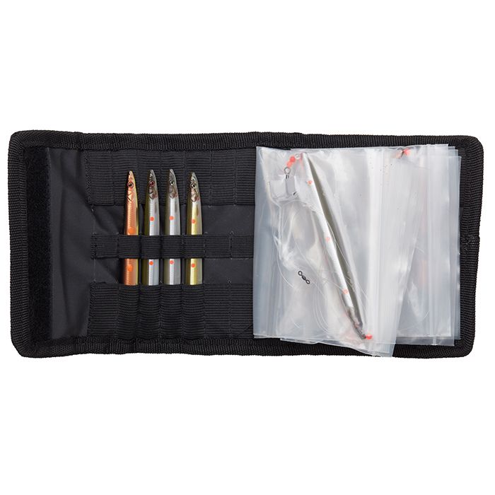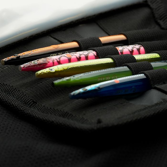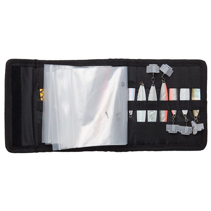 Pocket Flip wallet pour nos leurres line thru en tissu Soft durable 600Denier avec doublure intérieure et séparateurs élastiques. 8 sacs amovibles, à fermeture éclair, pour les leurres line thru ou les tracés pré-riggés, avec 8 protecteurs d'hameçons triples, pour les tailles #8-5 d'hameçons triples. Conçu pour s'adapter parfaitement aux poches des vestes de pêche. Peut contenir 14 leurres jusqu'à 13cm et 8 leurres pré-riggés, avec des traces dans des sacs zip-lock.